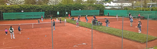 Die Netze hängen und die Freiluftplätze sind spielbereit. Sie brauchen allerdings am Anfang - wie zu Beginn jeder Sommersaison - besondere Schonung, da die Oberfläche noch zu weich für echten Wettkampf ist. Bitte berücksichtigen Sie dies. Vielen Dank!